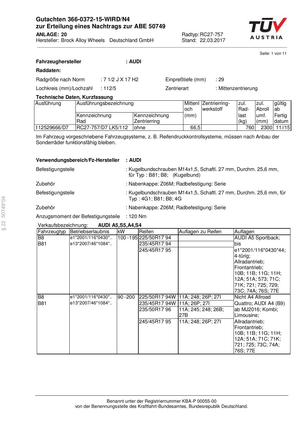 Dieses Gutachten (abe) bezieht sich auf die Alufelge Brock RC27-757 in der Ausführung 2Jx17 ET 0, Mittenloch 0 mm (KBA 50749). Im PDF findest du typischerweise zulässige Reifengrößen, Auflagen/Anbauhinweise und – je nach Dokument – Hinweise zur Eintragung.