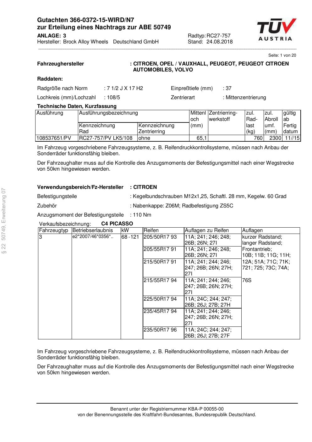 Dieses Gutachten (abe) bezieht sich auf die Alufelge Brock RC27-757 in der Ausführung 2Jx17 ET 0, Mittenloch 0 mm (KBA 50749). Im PDF findest du typischerweise zulässige Reifengrößen, Auflagen/Anbauhinweise und – je nach Dokument – Hinweise zur Eintragung.
