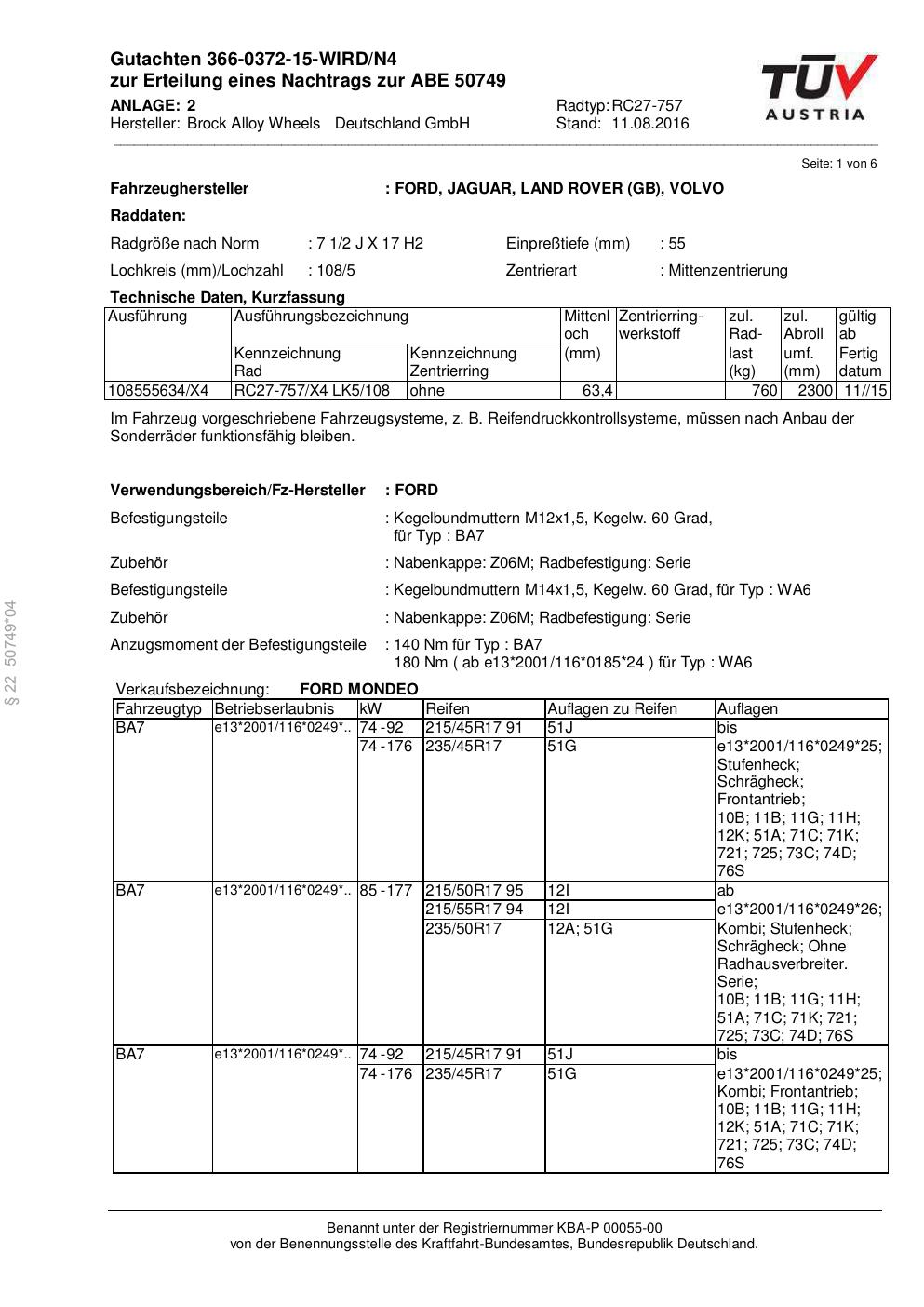 Felgengutachten / abe für Alufelgen Brock RC27-757 (2Jx17 ET 0, Mittenloch 0 mm) mit KBA 50749 (Zertifikatsnummer 50749). Hier kostenlos als PDF herunterladen. Der Download-Link ist 24 Stunden gültig und kann bis zu zwei Mal verwendet werden.
