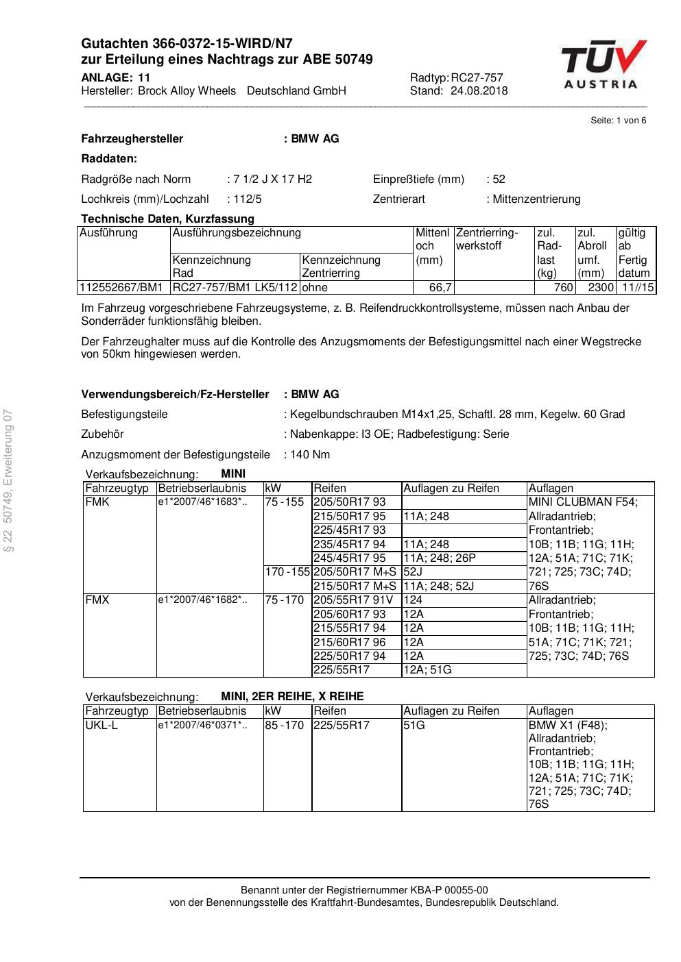 Dieses Gutachten (abe) bezieht sich auf die Alufelge Brock RC27-757 in der Ausführung 2Jx17 ET 0, Mittenloch 0 mm (KBA 50749). Im PDF findest du typischerweise zulässige Reifengrößen, Auflagen/Anbauhinweise und – je nach Dokument – Hinweise zur Eintragung.