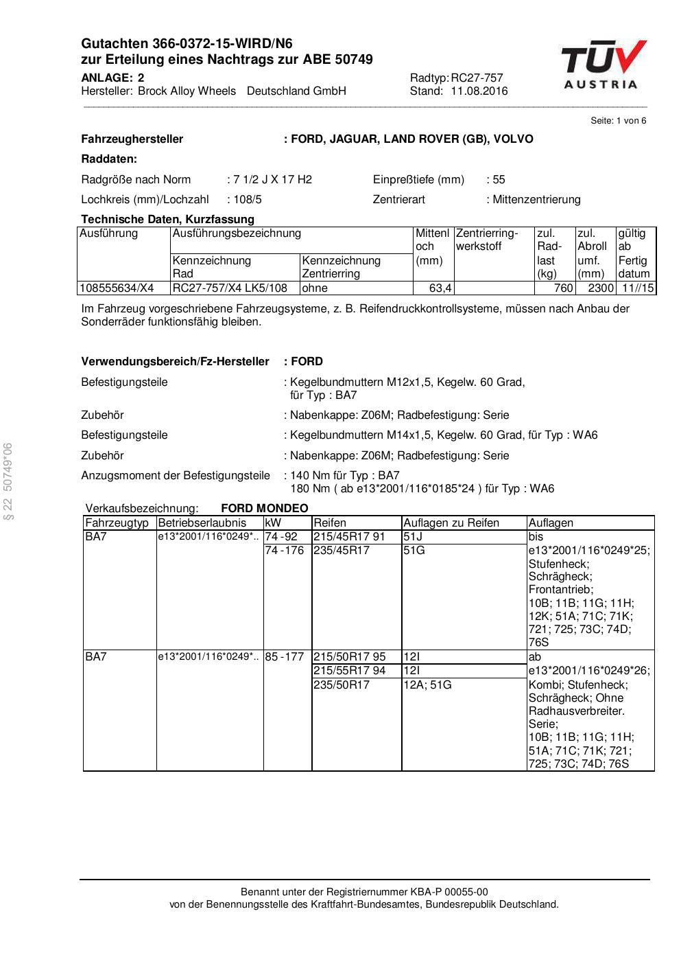 Dieses Gutachten (abe) bezieht sich auf die Alufelge Brock RC27-757 in der Ausführung 2Jx17 ET 0, Mittenloch 0 mm (KBA 50749). Im PDF findest du typischerweise zulässige Reifengrößen, Auflagen/Anbauhinweise und – je nach Dokument – Hinweise zur Eintragung.