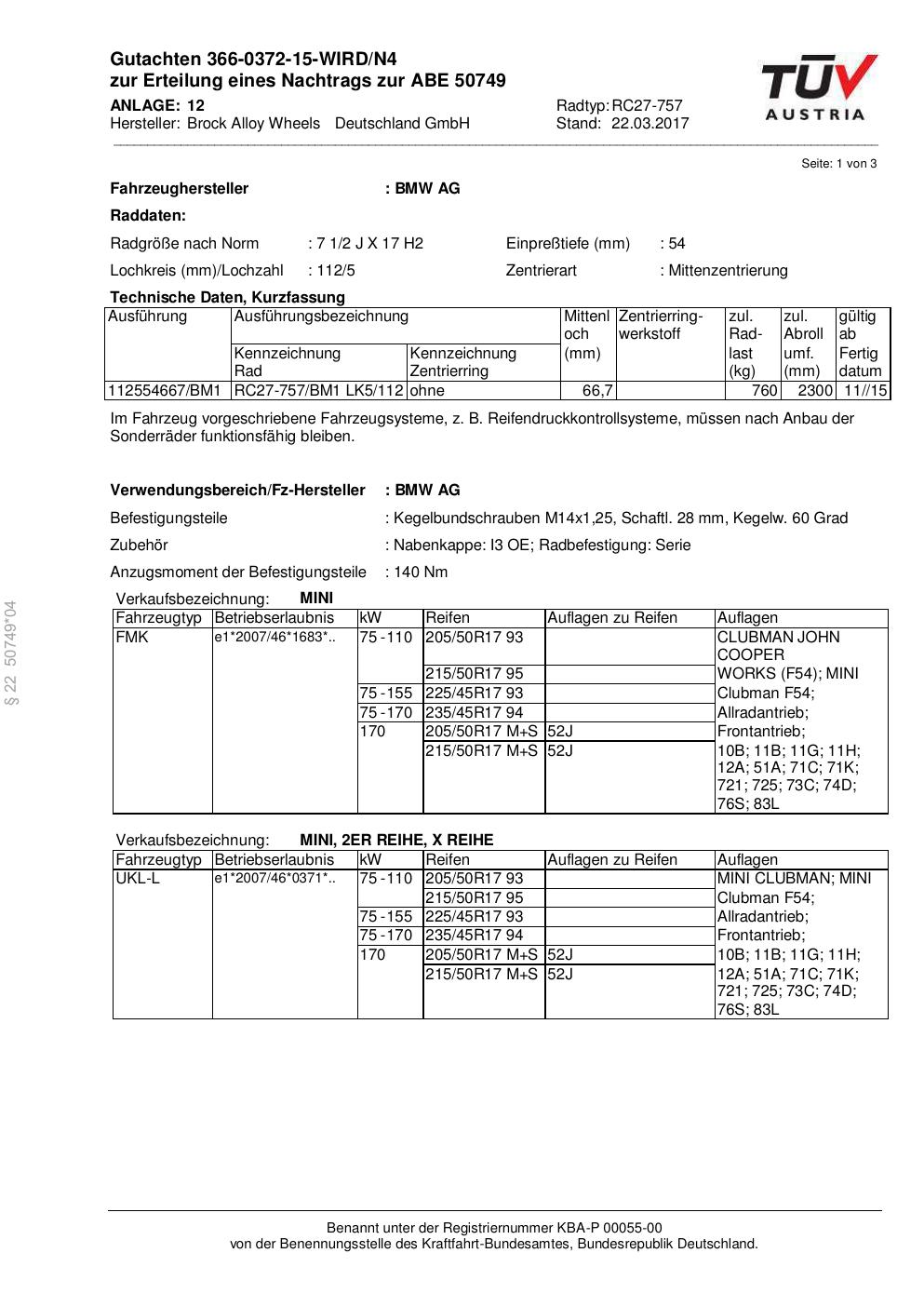 Dieses Gutachten (abe) bezieht sich auf die Alufelge Brock RC27-757 in der Ausführung 2Jx17 ET 0, Mittenloch 0 mm (KBA 50749). Im PDF findest du typischerweise zulässige Reifengrößen, Auflagen/Anbauhinweise und – je nach Dokument – Hinweise zur Eintragung.