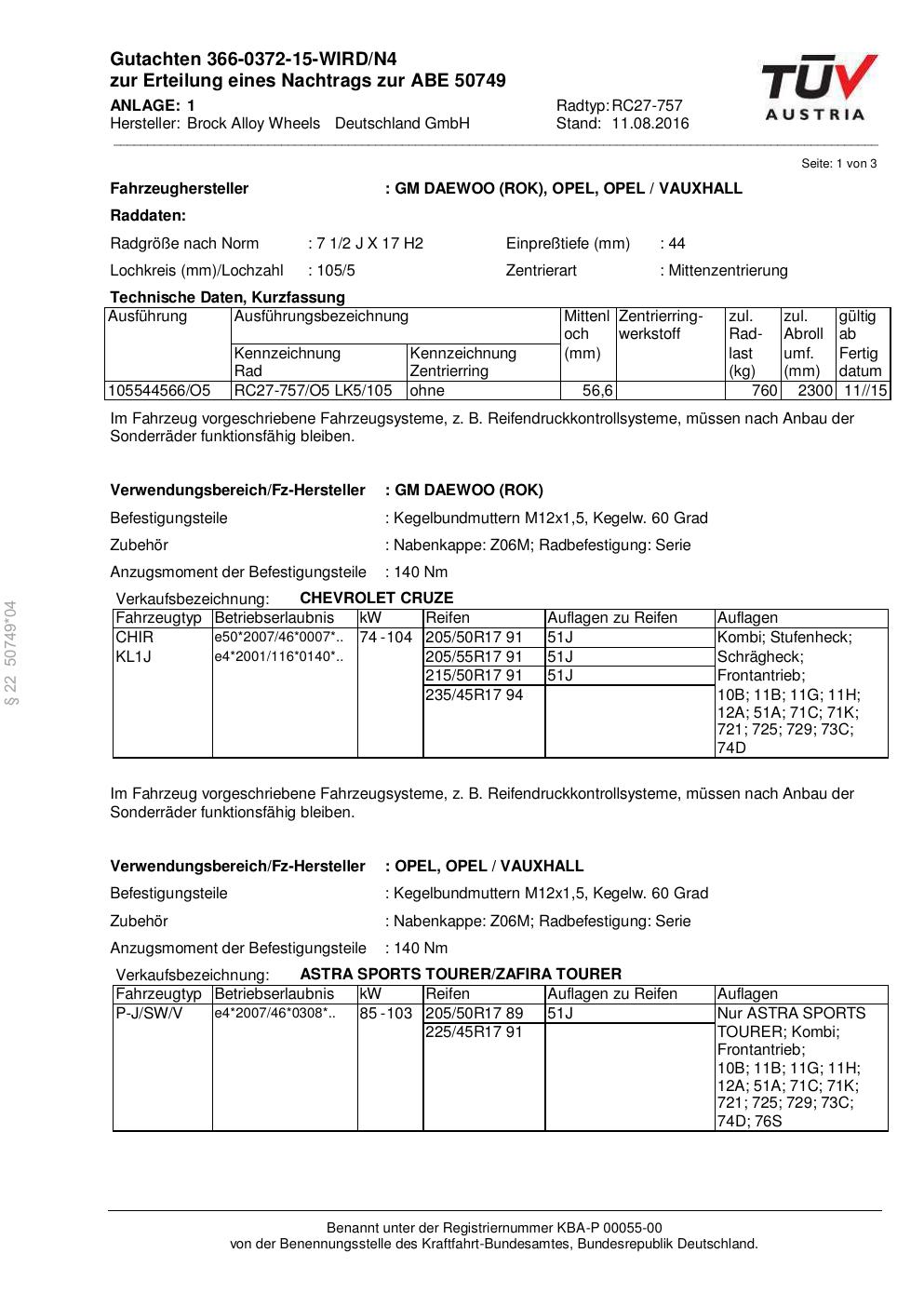 Dieses Gutachten (abe) bezieht sich auf die Alufelge Brock RC27-757 in der Ausführung 2Jx17 ET 0, Mittenloch 0 mm (KBA 50749). Im PDF findest du typischerweise zulässige Reifengrößen, Auflagen/Anbauhinweise und – je nach Dokument – Hinweise zur Eintragung.