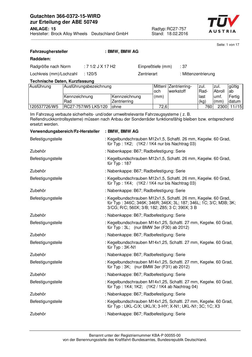 Dieses Gutachten (abe) bezieht sich auf die Alufelge Brock RC27 -757 in der Ausführung 2Jx17 ET 0, Mittenloch 0 mm (KBA 50749). Im PDF findest du typischerweise zulässige Reifengrößen, Auflagen/Anbauhinweise und – je nach Dokument – Hinweise zur Eintragung.