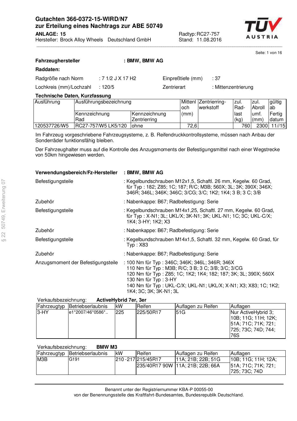 Dieses Gutachten (abe) bezieht sich auf die Alufelge Brock RC27-757 in der Ausführung 2Jx17 ET 0, Mittenloch 0 mm (KBA 50749). Im PDF findest du typischerweise zulässige Reifengrößen, Auflagen/Anbauhinweise und – je nach Dokument – Hinweise zur Eintragung.