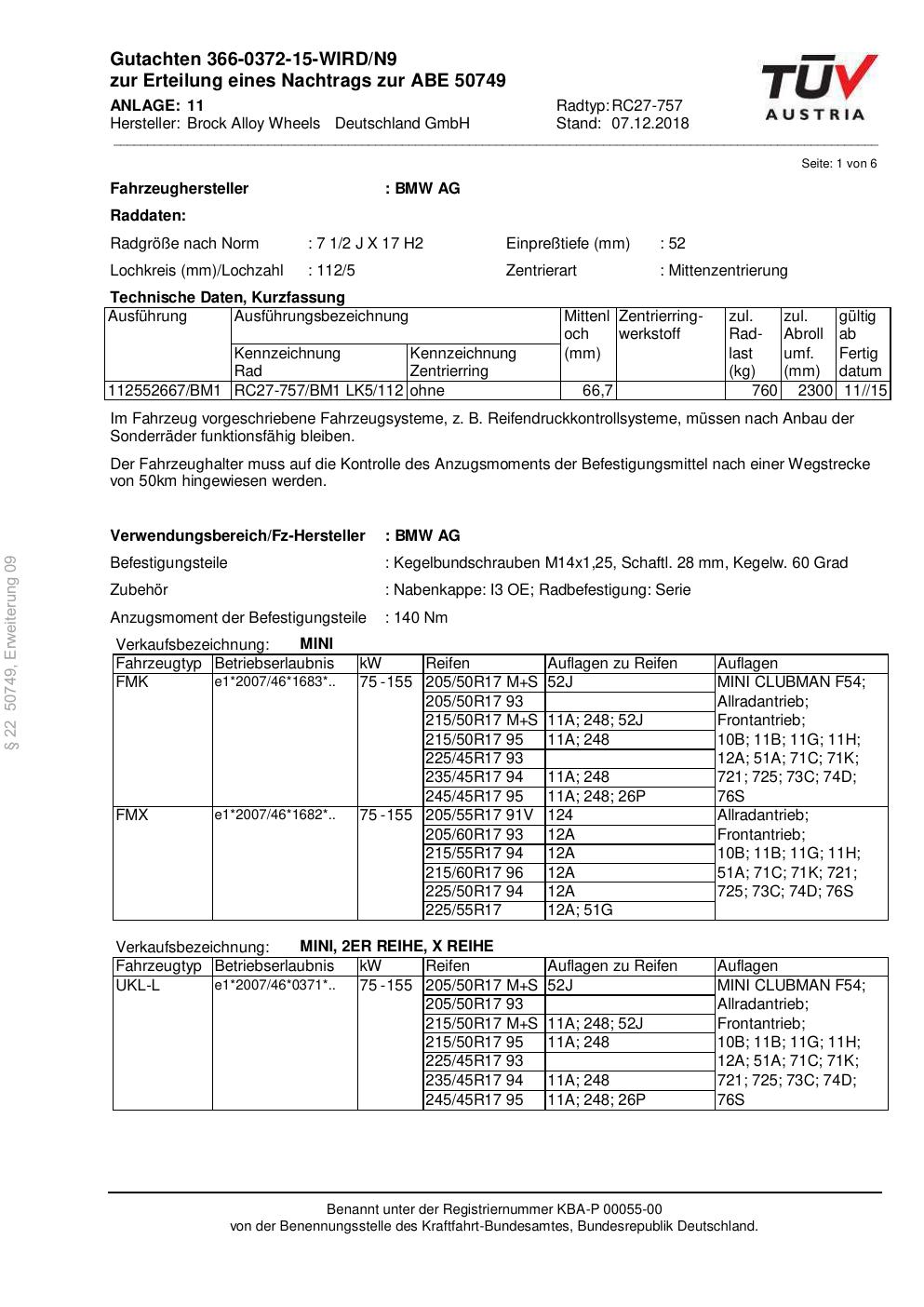 Dieses Gutachten (abe) bezieht sich auf die Alufelge Brock RC27-757 in der Ausführung 2Jx17 ET 0, Mittenloch 0 mm (KBA 50749). Im PDF findest du typischerweise zulässige Reifengrößen, Auflagen/Anbauhinweise und – je nach Dokument – Hinweise zur Eintragung.