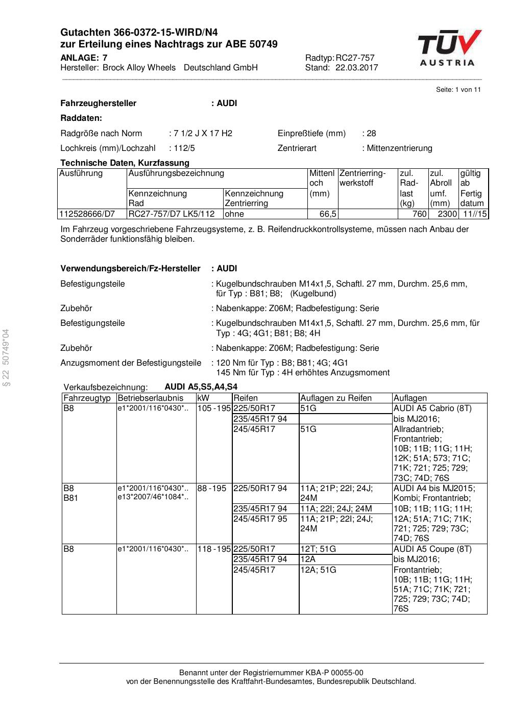 Felgengutachten / abe für Alufelgen Brock RC27-757 (2Jx17 ET 0, Mittenloch 0 mm) mit KBA 50749 (Zertifikatsnummer 50749). Hier kostenlos als PDF herunterladen. Der Download-Link ist 24 Stunden gültig und kann bis zu zwei Mal verwendet werden.