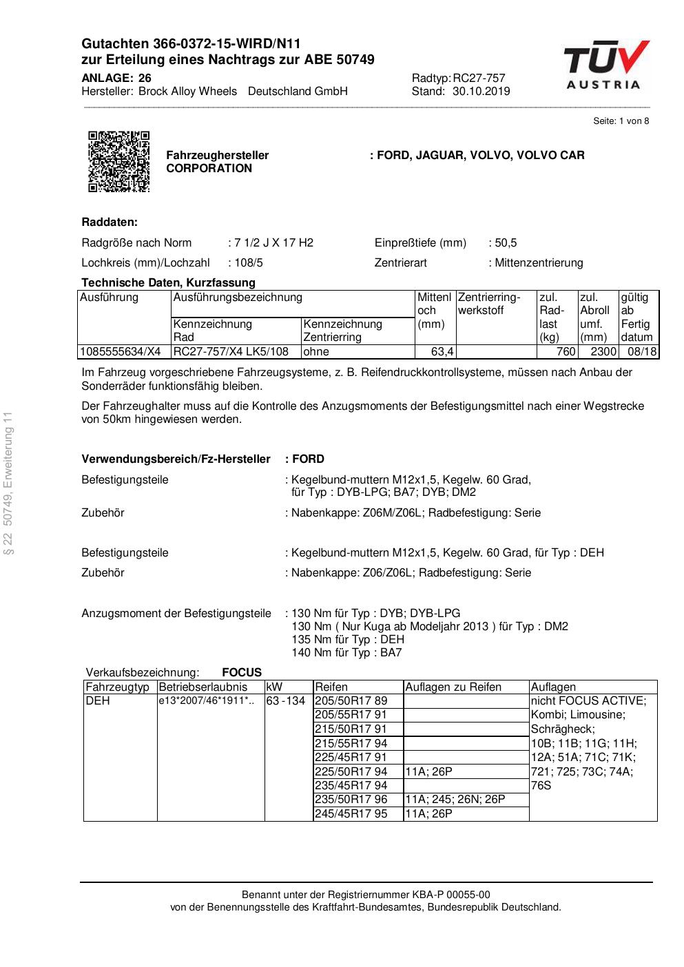 Dieses Gutachten (abe) bezieht sich auf die Alufelge Brock RC27-757 in der Ausführung 2Jx17 ET 0, Mittenloch 0 mm (KBA 50749). Im PDF findest du typischerweise zulässige Reifengrößen, Auflagen/Anbauhinweise und – je nach Dokument – Hinweise zur Eintragung.