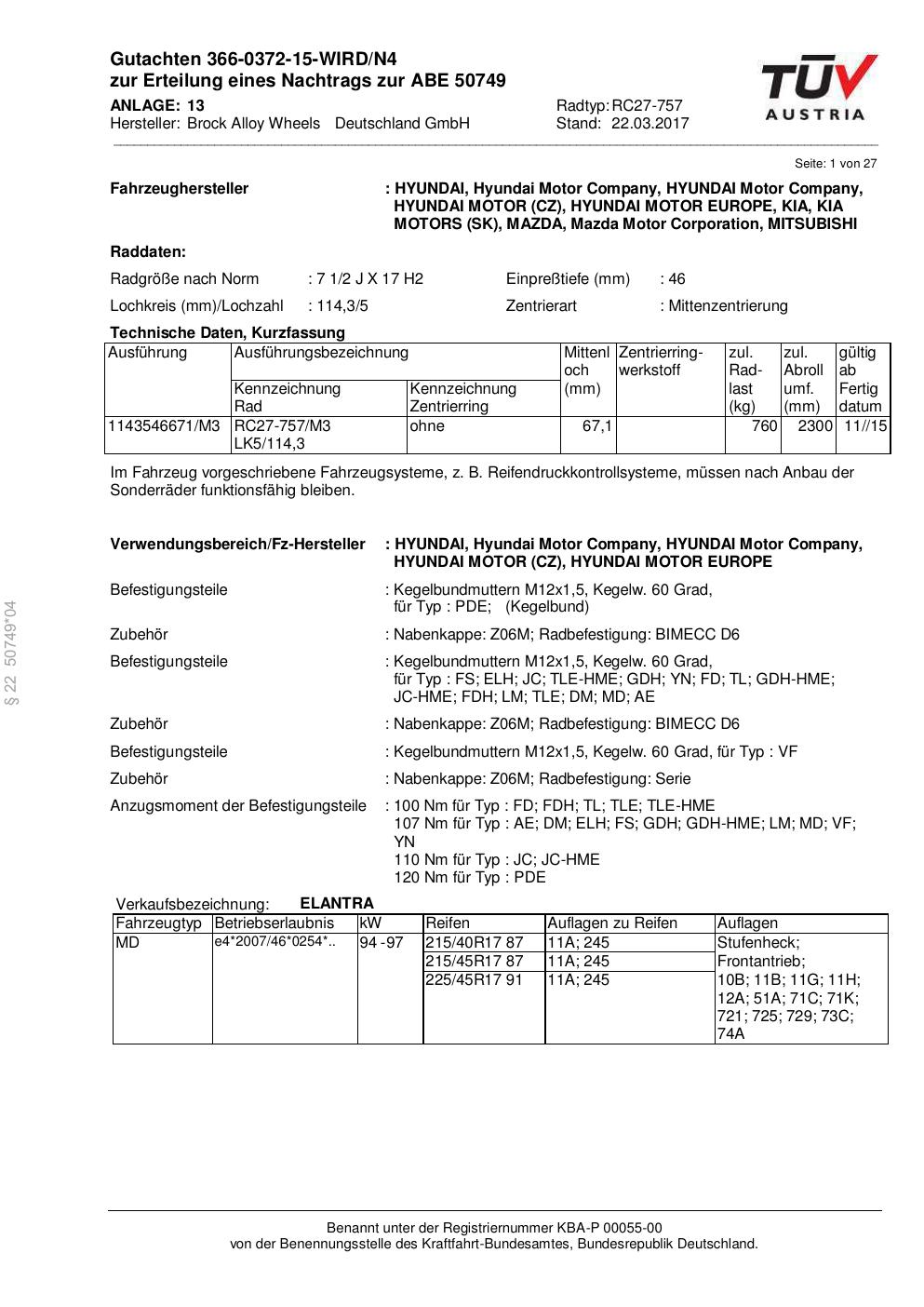 Felgengutachten / abe für Alufelgen Brock RC27-757 (2Jx17 ET 0, Mittenloch 0 mm) mit KBA 50749 (Zertifikatsnummer 50749). Hier kostenlos als PDF herunterladen. Der Download-Link ist 24 Stunden gültig und kann bis zu zwei Mal verwendet werden.