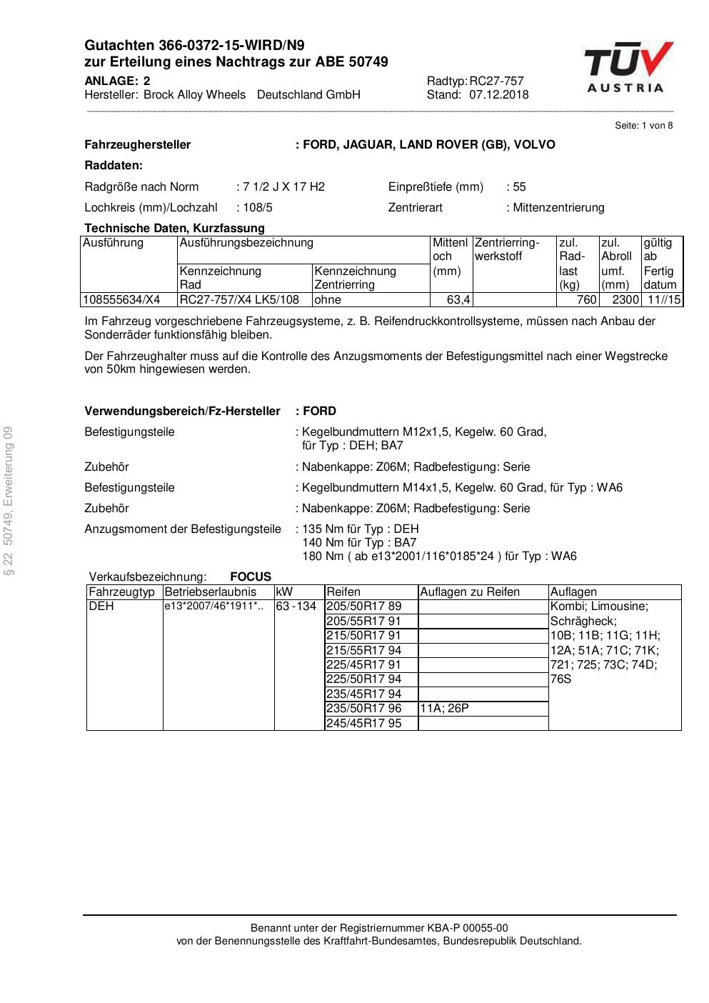 Dieses Gutachten (abe) bezieht sich auf die Alufelge Brock RC27-757 in der Ausführung 2Jx17 ET 0, Mittenloch 0 mm (KBA 50749). Im PDF findest du typischerweise zulässige Reifengrößen, Auflagen/Anbauhinweise und – je nach Dokument – Hinweise zur Eintragung.