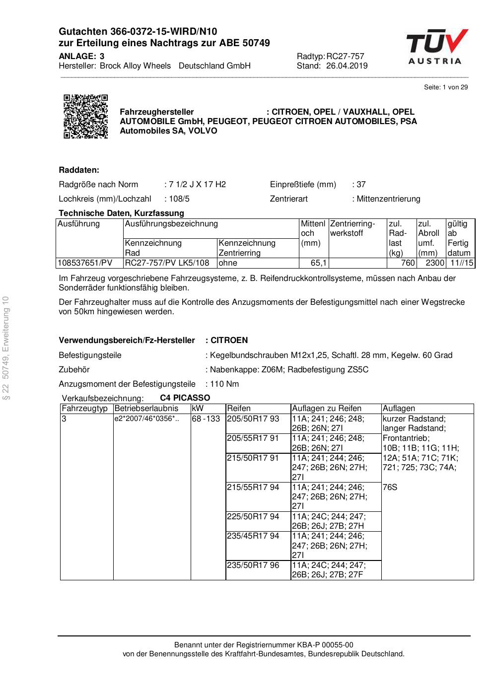 Felgengutachten / abe für Alufelgen Brock RC27-757 (2Jx17 ET 0, Mittenloch 0 mm) mit KBA 50749 (Zertifikatsnummer 50749). Hier kostenlos als PDF herunterladen. Der Download-Link ist 24 Stunden gültig und kann bis zu zwei Mal verwendet werden.