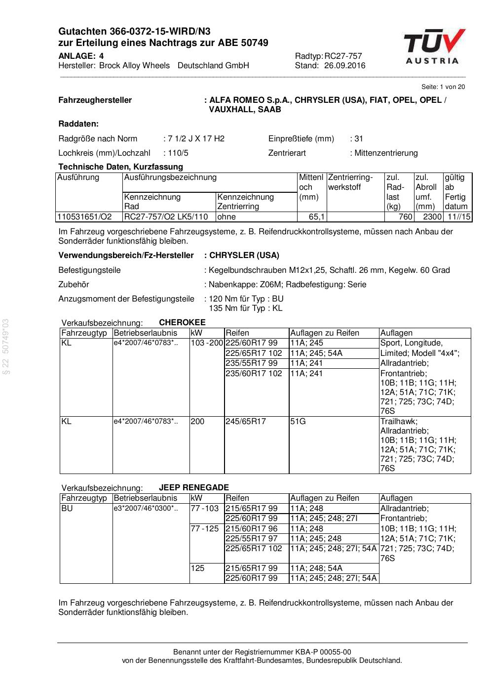 Dieses Gutachten (abe) bezieht sich auf die Alufelge Brock RC27-757 in der Ausführung 2Jx17 ET 0, Mittenloch 0 mm (KBA 50749). Im PDF findest du typischerweise zulässige Reifengrößen, Auflagen/Anbauhinweise und – je nach Dokument – Hinweise zur Eintragung.