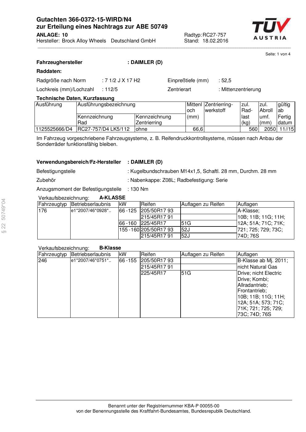 Dieses Gutachten (abe) bezieht sich auf die Alufelge Brock RC27-757 in der Ausführung 2Jx17 ET 0, Mittenloch 0 mm (KBA 50749). Im PDF findest du typischerweise zulässige Reifengrößen, Auflagen/Anbauhinweise und – je nach Dokument – Hinweise zur Eintragung.