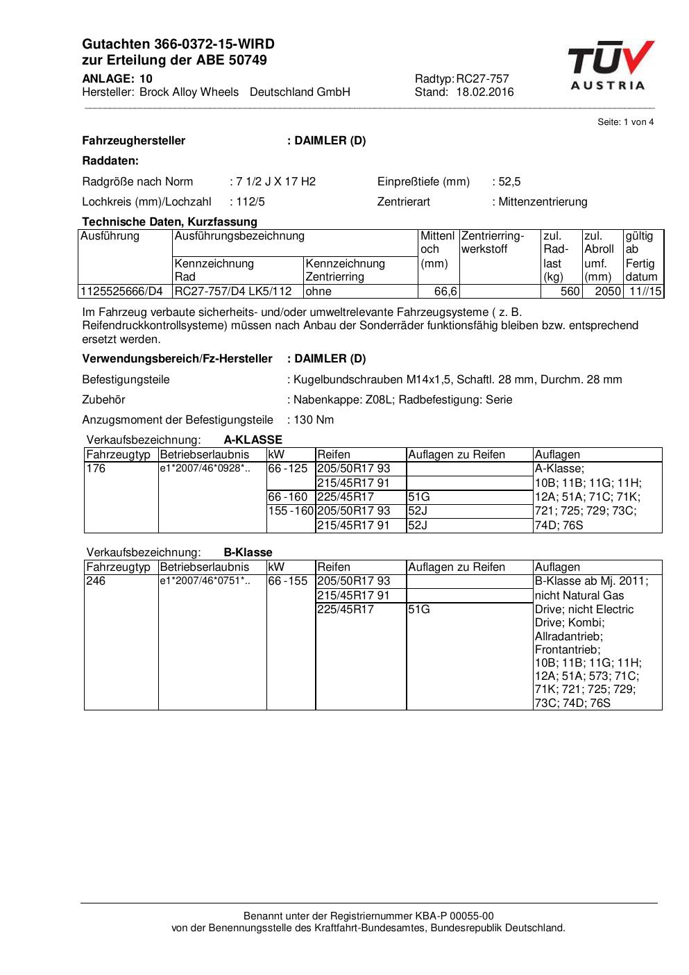 Dieses Gutachten (abe) bezieht sich auf die Alufelge Brock RC27 -757 in der Ausführung 2Jx17 ET 0, Mittenloch 0 mm (KBA 50749). Im PDF findest du typischerweise zulässige Reifengrößen, Auflagen/Anbauhinweise und – je nach Dokument – Hinweise zur Eintragung.