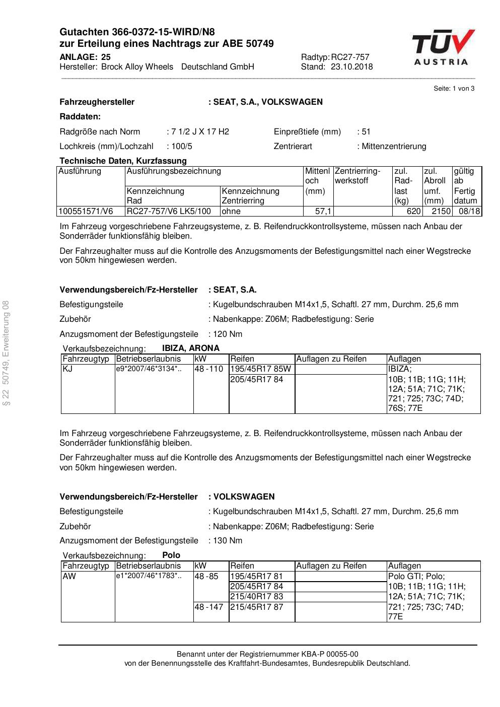Dieses Gutachten (abe) bezieht sich auf die Alufelge Brock RC27-757 in der Ausführung 2Jx17 ET 0, Mittenloch 0 mm (KBA 50749). Im PDF findest du typischerweise zulässige Reifengrößen, Auflagen/Anbauhinweise und – je nach Dokument – Hinweise zur Eintragung.