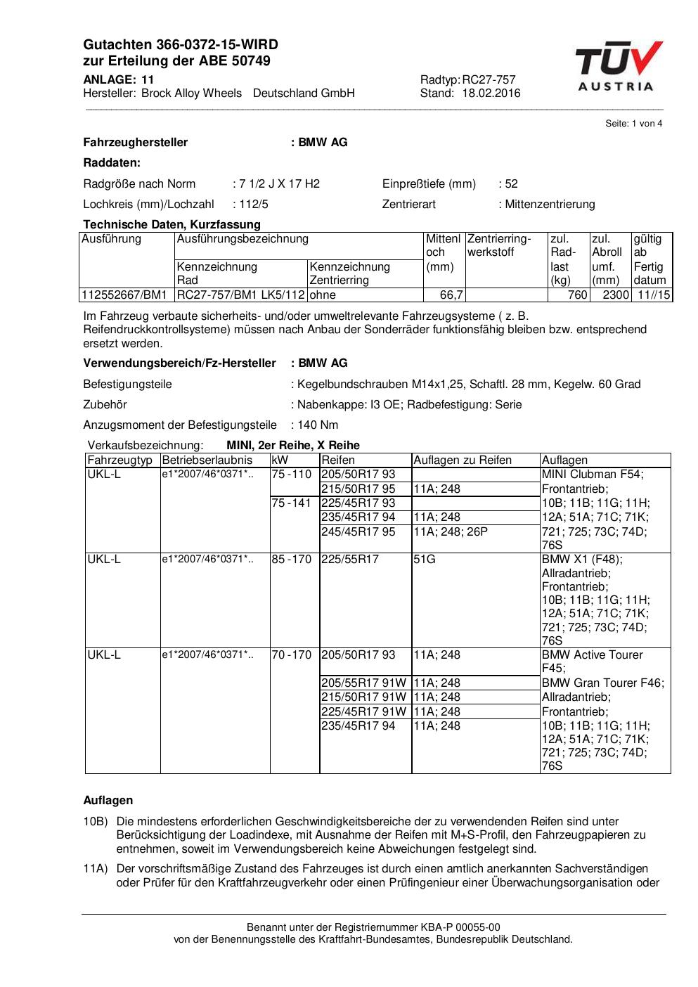 Dieses Gutachten (abe) bezieht sich auf die Alufelge Brock RC27 -757 in der Ausführung 2Jx17 ET 0, Mittenloch 0 mm (KBA 50749). Im PDF findest du typischerweise zulässige Reifengrößen, Auflagen/Anbauhinweise und – je nach Dokument – Hinweise zur Eintragung.