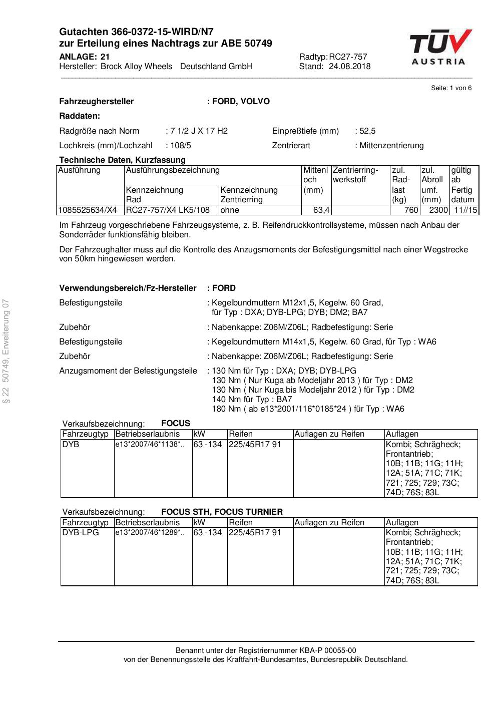Dieses Gutachten (abe) bezieht sich auf die Alufelge Brock RC27-757 in der Ausführung 2Jx17 ET 0, Mittenloch 0 mm (KBA 50749). Im PDF findest du typischerweise zulässige Reifengrößen, Auflagen/Anbauhinweise und – je nach Dokument – Hinweise zur Eintragung.