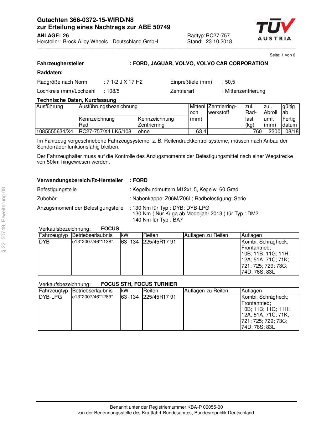 Dieses Gutachten (abe) bezieht sich auf die Alufelge Brock RC27-757 in der Ausführung 2Jx17 ET 0, Mittenloch 0 mm (KBA 50749). Im PDF findest du typischerweise zulässige Reifengrößen, Auflagen/Anbauhinweise und – je nach Dokument – Hinweise zur Eintragung.