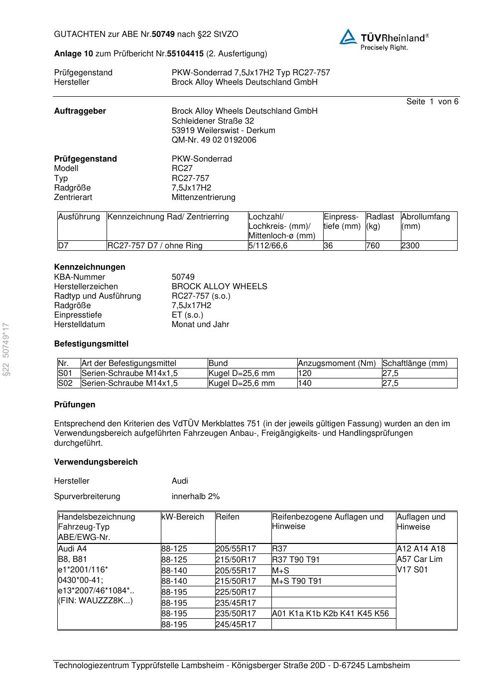 Dieses Gutachten (abe) bezieht sich auf die Alufelge Brock RC27-757 in der Ausführung 7.5Jx17 ET 0, Mittenloch 0 mm (KBA 50749). Im PDF findest du typischerweise zulässige Reifengrößen, Auflagen/Anbauhinweise und – je nach Dokument – Hinweise zur Eintragung.
