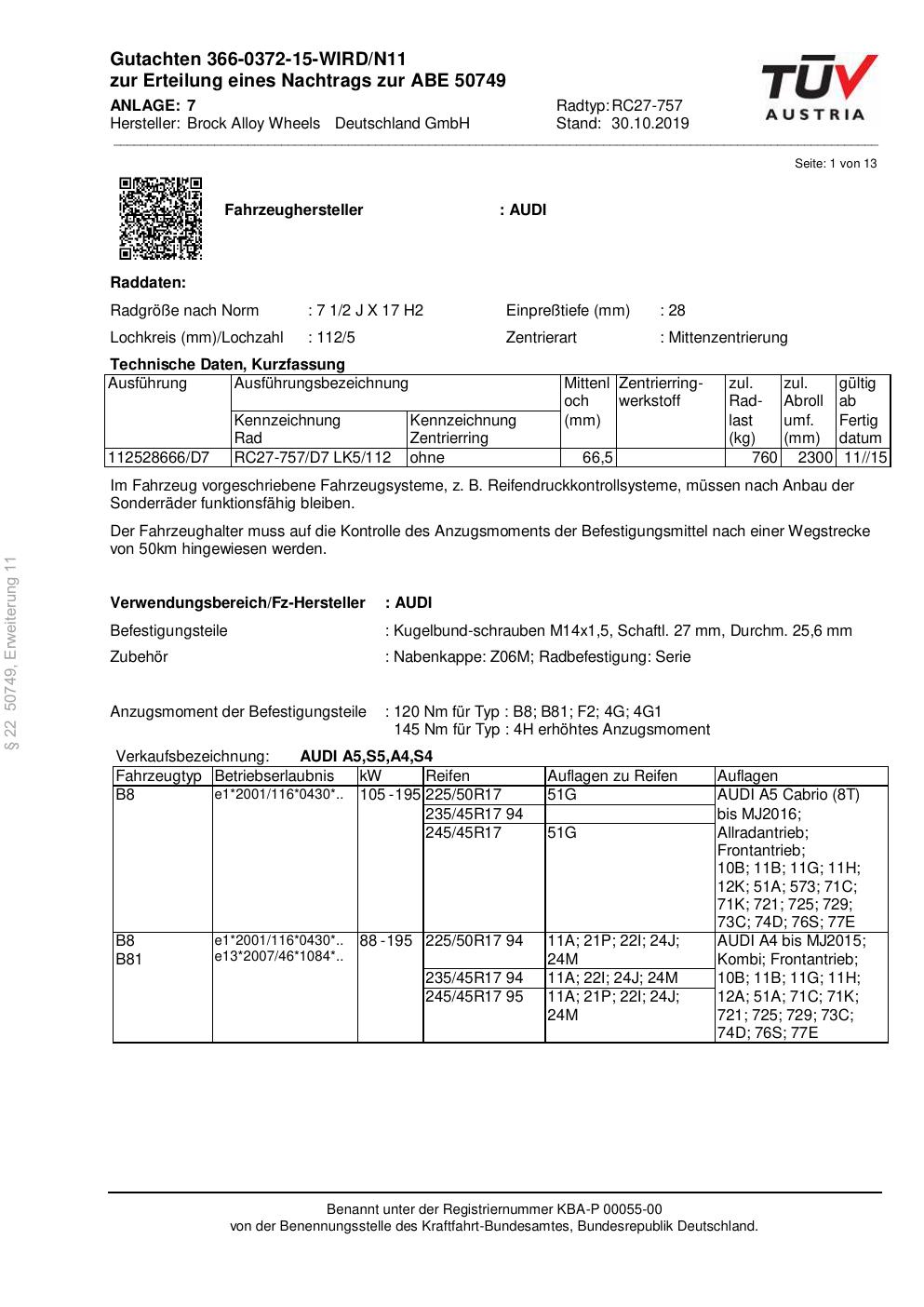 Dieses Gutachten (abe) bezieht sich auf die Alufelge Brock RC27-757 in der Ausführung 2Jx17 ET 0, Mittenloch 0 mm (KBA 50749). Im PDF findest du typischerweise zulässige Reifengrößen, Auflagen/Anbauhinweise und – je nach Dokument – Hinweise zur Eintragung.