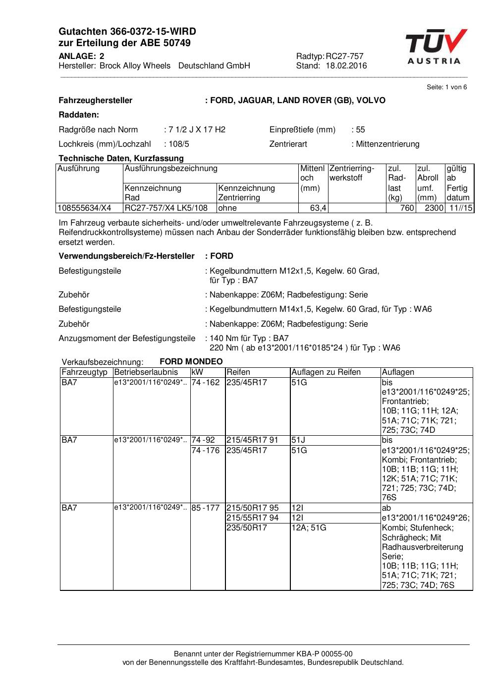 Dieses Gutachten (abe) bezieht sich auf die Alufelge Brock RC27 -757 in der Ausführung 2Jx17 ET 0, Mittenloch 0 mm (KBA 50749). Im PDF findest du typischerweise zulässige Reifengrößen, Auflagen/Anbauhinweise und – je nach Dokument – Hinweise zur Eintragung.