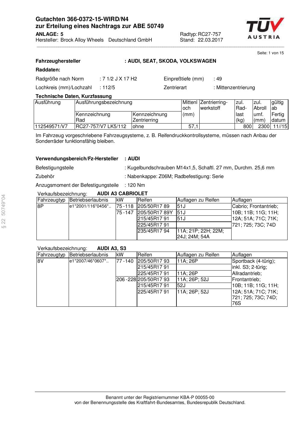 Dieses Gutachten (abe) bezieht sich auf die Alufelge Brock RC27-757 in der Ausführung 2Jx17 ET 0, Mittenloch 0 mm (KBA 50749). Im PDF findest du typischerweise zulässige Reifengrößen, Auflagen/Anbauhinweise und – je nach Dokument – Hinweise zur Eintragung.