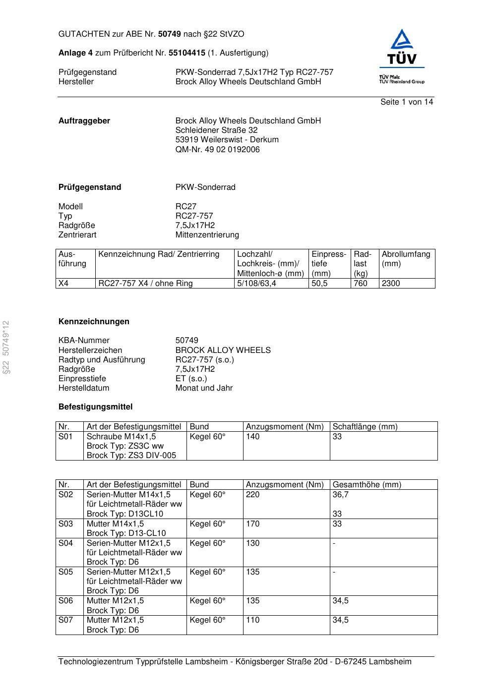 Dieses Gutachten (abe) bezieht sich auf die Alufelge Brock RC27-757 in der Ausführung 7.5Jx17 ET 0, Mittenloch 0 mm (KBA 50749). Im PDF findest du typischerweise zulässige Reifengrößen, Auflagen/Anbauhinweise und – je nach Dokument – Hinweise zur Eintragung.