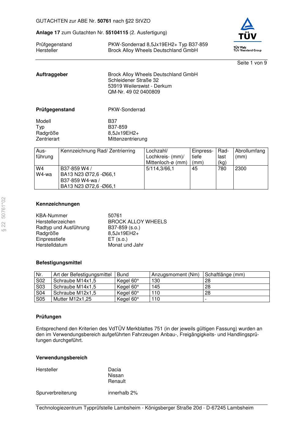 Dieses Gutachten (abe) bezieht sich auf die Alufelge Brock B37-85 9 in der Ausführung ET 0, Mittenloch 0 mm (KBA 50761). Im PDF findest du typischerweise zulässige Reifengrößen, Auflagen/Anbauhinweise und – je nach Dokument – Hinweise zur Eintragung.