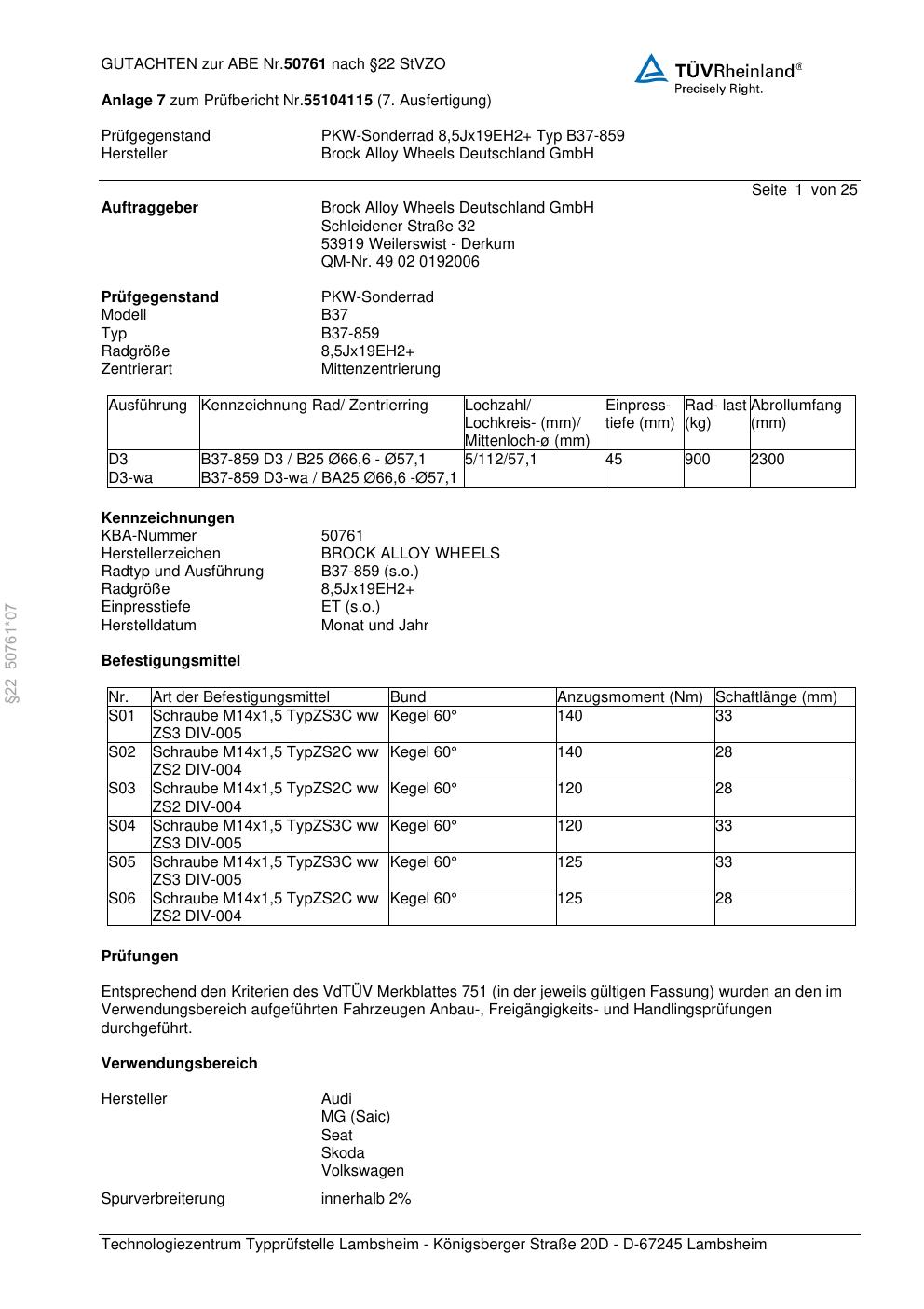 Dieses Gutachten (abe) bezieht sich auf die Alufelge Brock B37-85 9 in der Ausführung ET 0, Mittenloch 0 mm (KBA 50761). Im PDF findest du typischerweise zulässige Reifengrößen, Auflagen/Anbauhinweise und – je nach Dokument – Hinweise zur Eintragung.