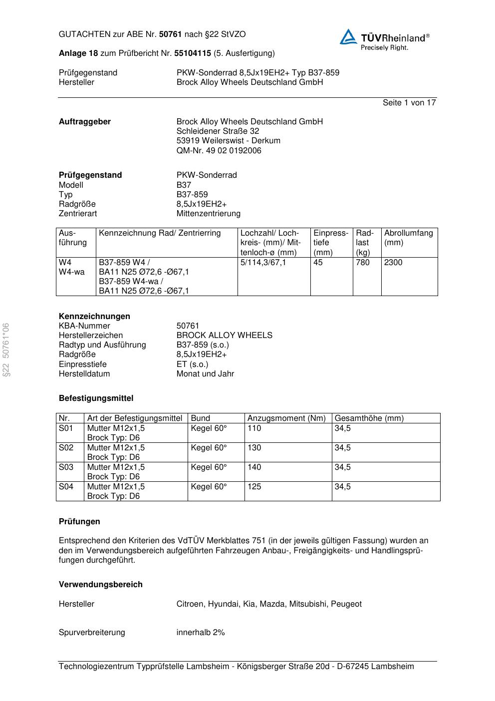 Dieses Gutachten (abe) bezieht sich auf die Alufelge Brock B37-85 9 in der Ausführung ET 0, Mittenloch 0 mm (KBA 50761). Im PDF findest du typischerweise zulässige Reifengrößen, Auflagen/Anbauhinweise und – je nach Dokument – Hinweise zur Eintragung.