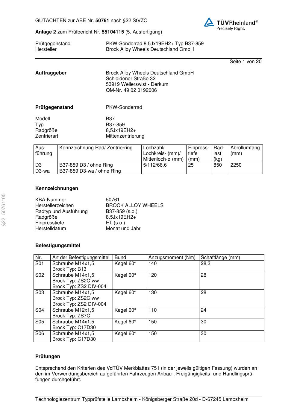 Dieses Gutachten (abe) bezieht sich auf die Alufelge Brock B37-85 9 in der Ausführung ET 0, Mittenloch 0 mm (KBA 50761). Im PDF findest du typischerweise zulässige Reifengrößen, Auflagen/Anbauhinweise und – je nach Dokument – Hinweise zur Eintragung.