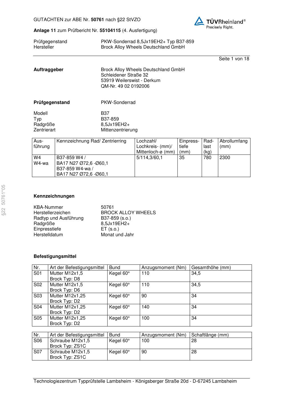 Dieses Gutachten (abe) bezieht sich auf die Alufelge Brock B37-85 9 in der Ausführung ET 0, Mittenloch 0 mm (KBA 50761). Im PDF findest du typischerweise zulässige Reifengrößen, Auflagen/Anbauhinweise und – je nach Dokument – Hinweise zur Eintragung.