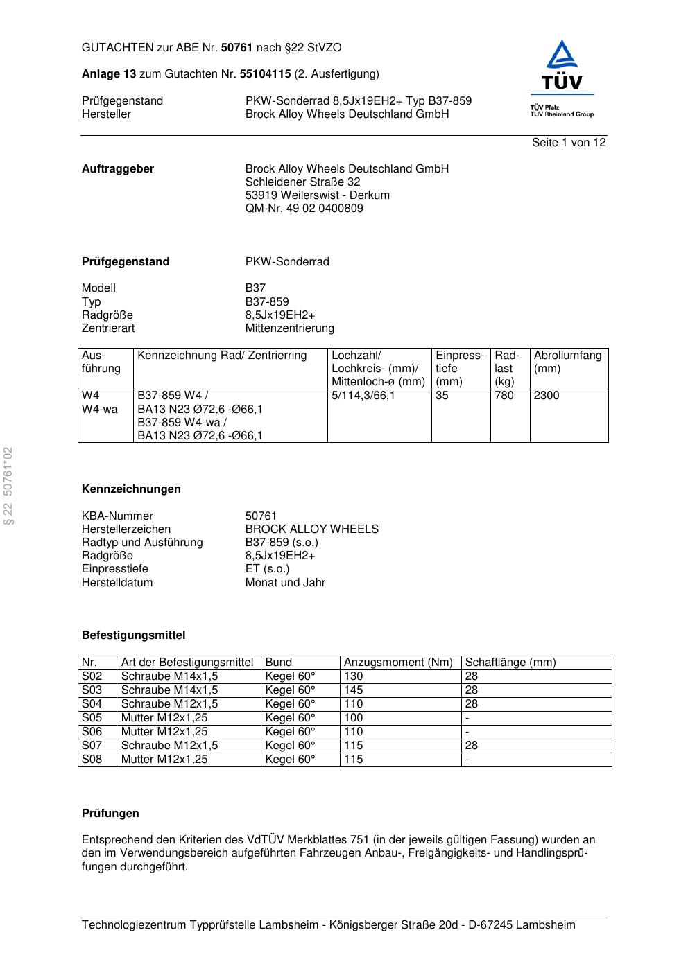 Dieses Gutachten (abe) bezieht sich auf die Alufelge Brock B37-85 9 in der Ausführung ET 0, Mittenloch 0 mm (KBA 50761). Im PDF findest du typischerweise zulässige Reifengrößen, Auflagen/Anbauhinweise und – je nach Dokument – Hinweise zur Eintragung.