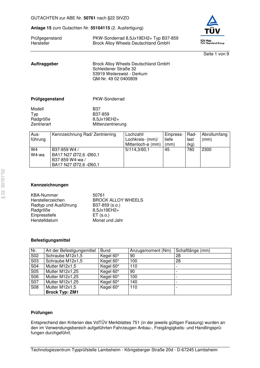 Dieses Gutachten (abe) bezieht sich auf die Alufelge Brock B37-85 9 in der Ausführung ET 0, Mittenloch 0 mm (KBA 50761). Im PDF findest du typischerweise zulässige Reifengrößen, Auflagen/Anbauhinweise und – je nach Dokument – Hinweise zur Eintragung.