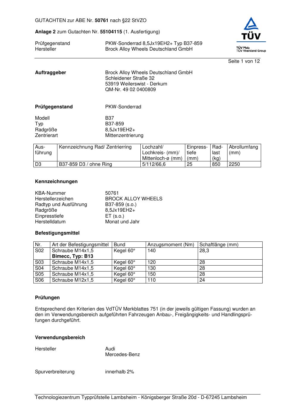 Dieses Gutachten (abe) bezieht sich auf die Alufelge Brock B37-85 9 in der Ausführung ET 0, Mittenloch 0 mm (KBA 50761). Im PDF findest du typischerweise zulässige Reifengrößen, Auflagen/Anbauhinweise und – je nach Dokument – Hinweise zur Eintragung.