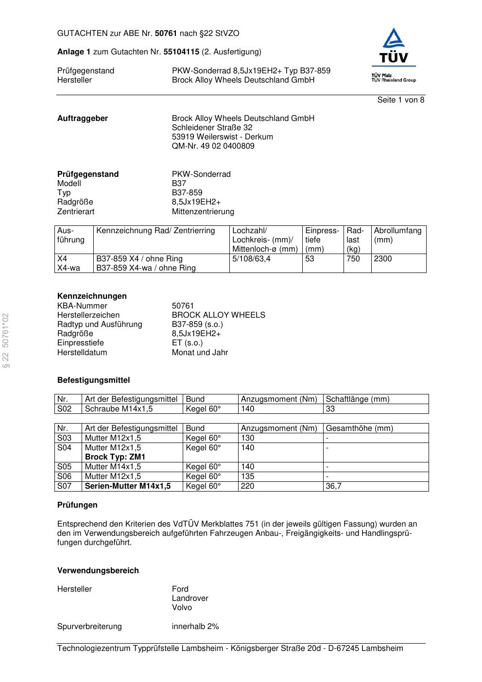 Dieses Gutachten (abe) bezieht sich auf die Alufelge Brock B37-85 9 in der Ausführung ET 0, Mittenloch 0 mm (KBA 50761). Im PDF findest du typischerweise zulässige Reifengrößen, Auflagen/Anbauhinweise und – je nach Dokument – Hinweise zur Eintragung.