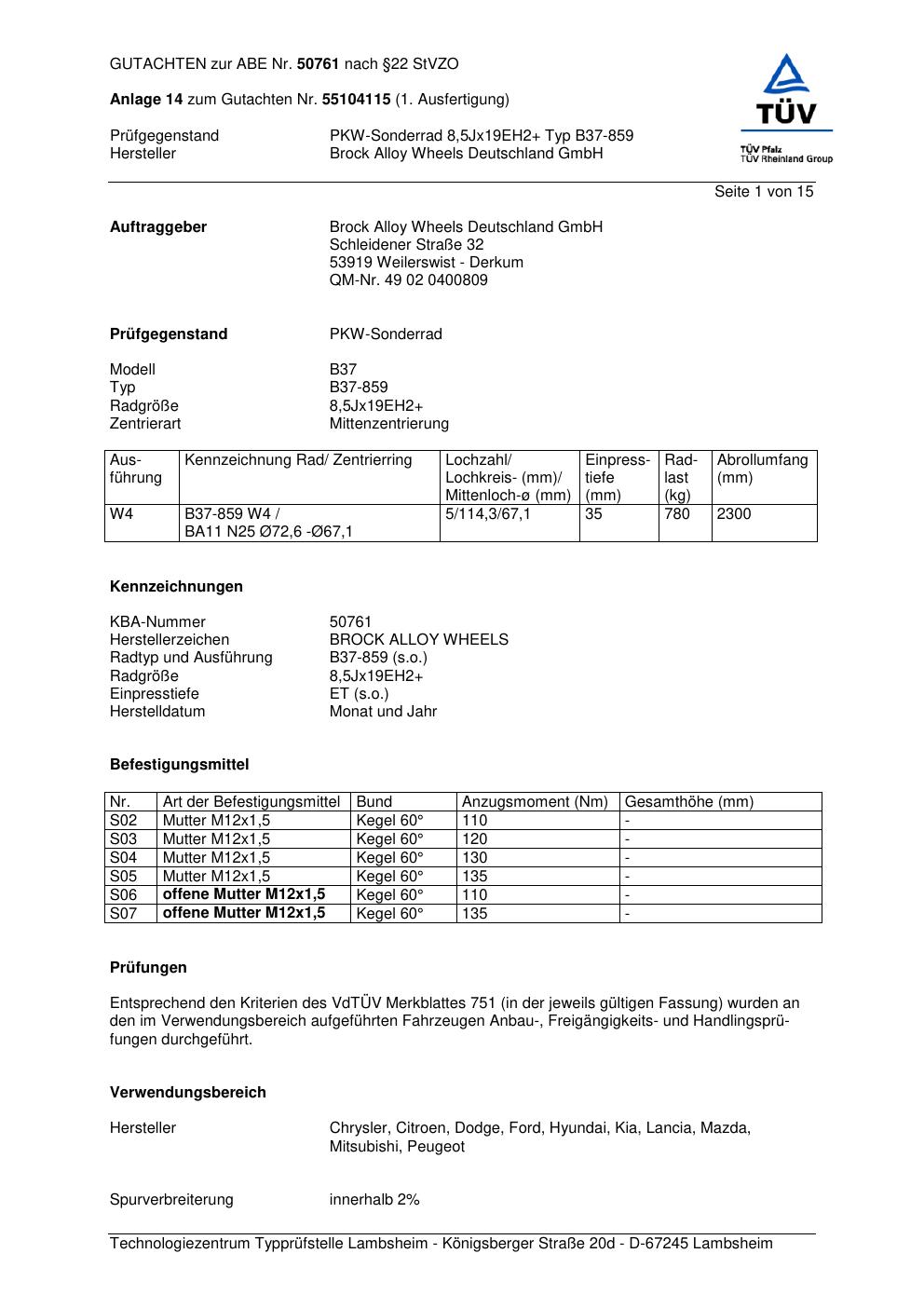 Dieses Gutachten (abe) bezieht sich auf die Alufelge Brock B37-85 9 in der Ausführung ET 0, Mittenloch 0 mm (KBA 50761). Im PDF findest du typischerweise zulässige Reifengrößen, Auflagen/Anbauhinweise und – je nach Dokument – Hinweise zur Eintragung.