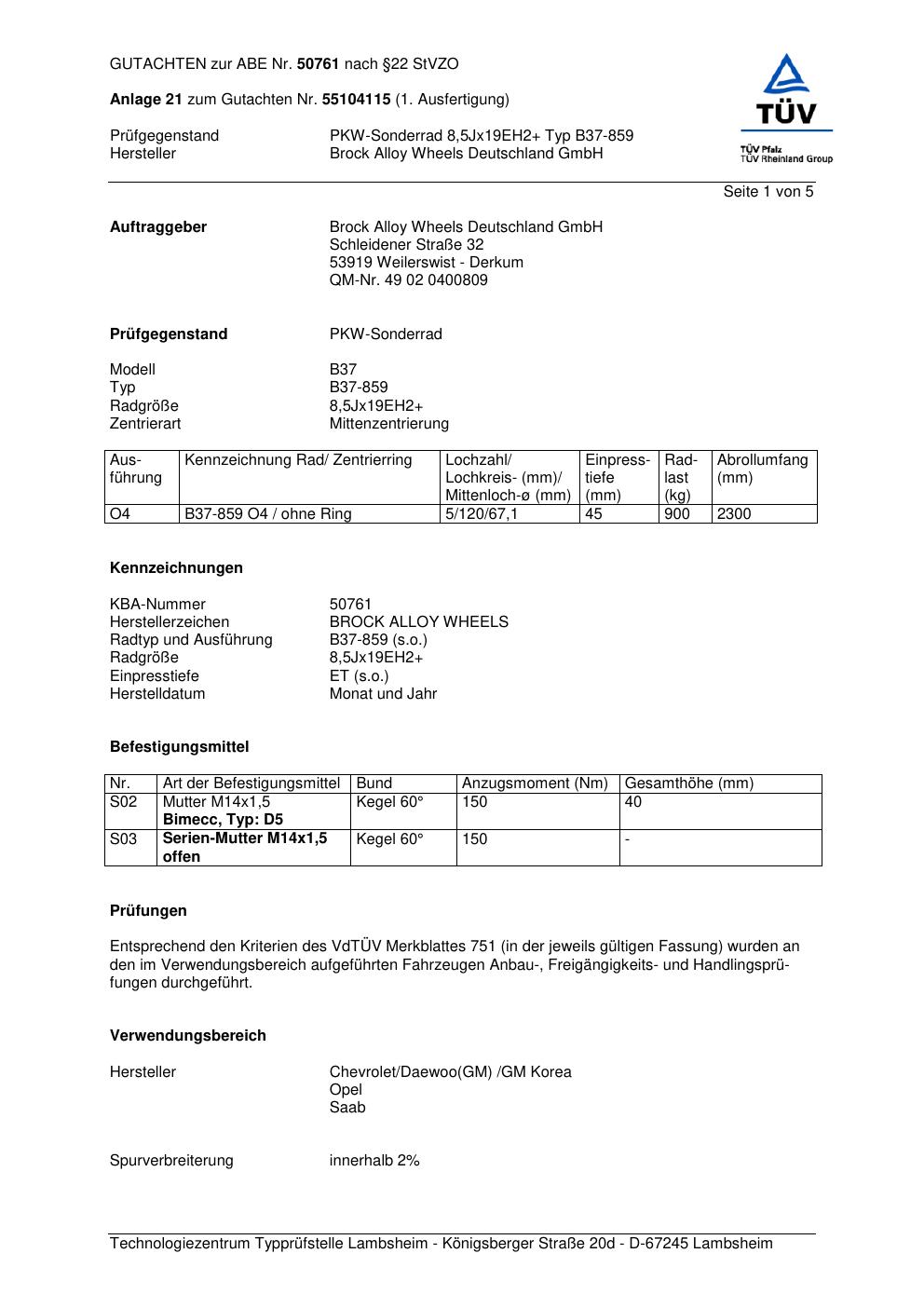 Dieses Gutachten (abe) bezieht sich auf die Alufelge Brock B37-85 9 in der Ausführung ET 0, Mittenloch 0 mm (KBA 50761). Im PDF findest du typischerweise zulässige Reifengrößen, Auflagen/Anbauhinweise und – je nach Dokument – Hinweise zur Eintragung.