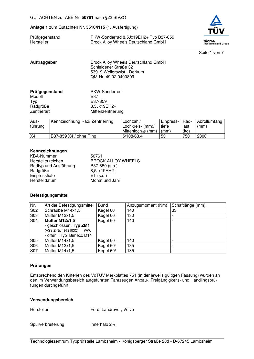 Dieses Gutachten (abe) bezieht sich auf die Alufelge Brock B37-85 9 in der Ausführung ET 0, Mittenloch 0 mm (KBA 50761). Im PDF findest du typischerweise zulässige Reifengrößen, Auflagen/Anbauhinweise und – je nach Dokument – Hinweise zur Eintragung.