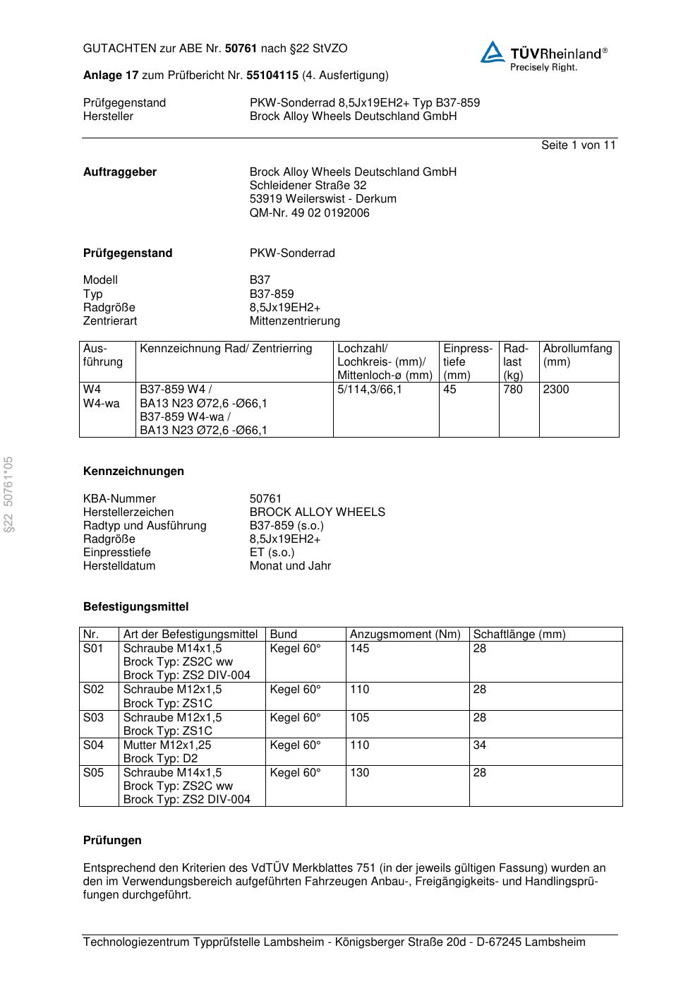 Dieses Gutachten (abe) bezieht sich auf die Alufelge Brock B37-85 9 in der Ausführung ET 0, Mittenloch 0 mm (KBA 50761). Im PDF findest du typischerweise zulässige Reifengrößen, Auflagen/Anbauhinweise und – je nach Dokument – Hinweise zur Eintragung.
