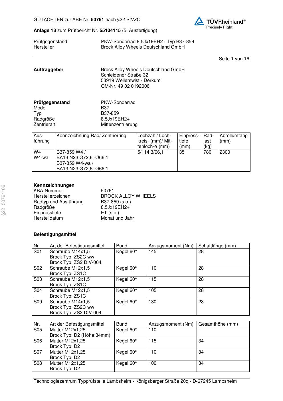 Dieses Gutachten (abe) bezieht sich auf die Alufelge Brock B37-85 9 in der Ausführung ET 0, Mittenloch 0 mm (KBA 50761). Im PDF findest du typischerweise zulässige Reifengrößen, Auflagen/Anbauhinweise und – je nach Dokument – Hinweise zur Eintragung.