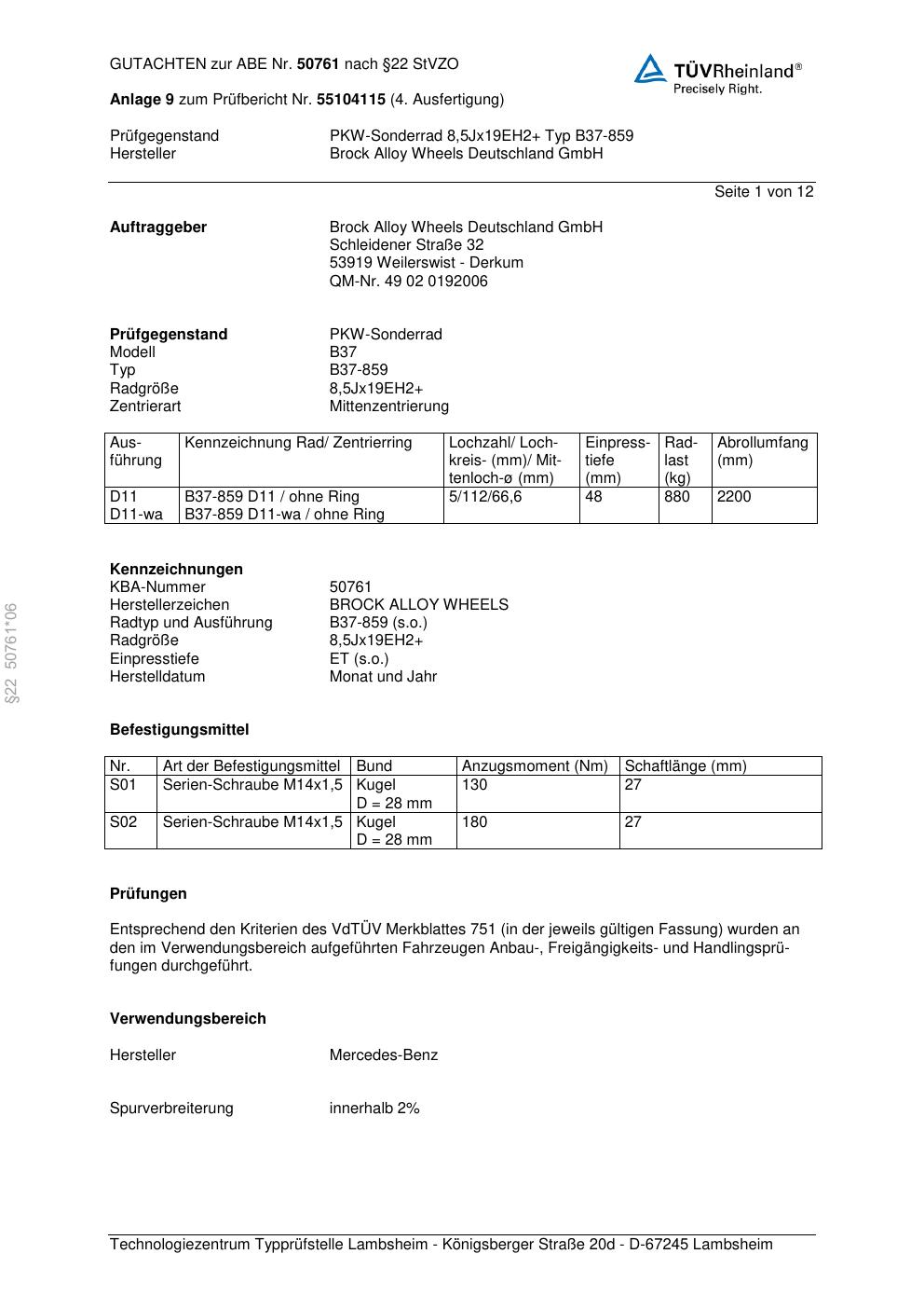 Dieses Gutachten (abe) bezieht sich auf die Alufelge Brock B37-85 9 in der Ausführung ET 0, Mittenloch 0 mm (KBA 50761). Im PDF findest du typischerweise zulässige Reifengrößen, Auflagen/Anbauhinweise und – je nach Dokument – Hinweise zur Eintragung.