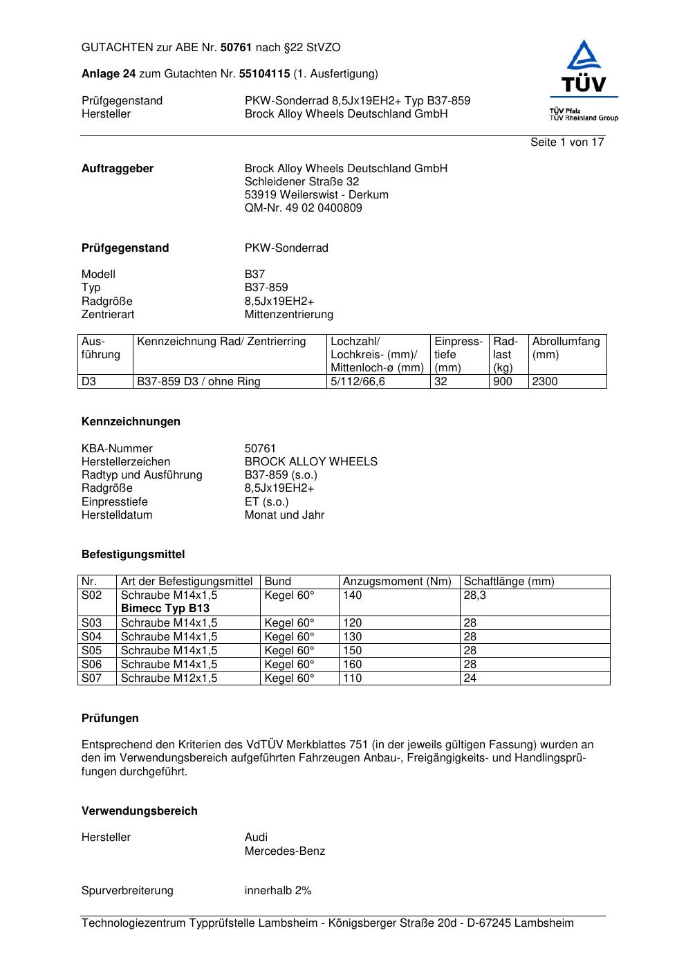 Dieses Gutachten (abe) bezieht sich auf die Alufelge Brock B37-85 9 in der Ausführung ET 0, Mittenloch 0 mm (KBA 50761). Im PDF findest du typischerweise zulässige Reifengrößen, Auflagen/Anbauhinweise und – je nach Dokument – Hinweise zur Eintragung.
