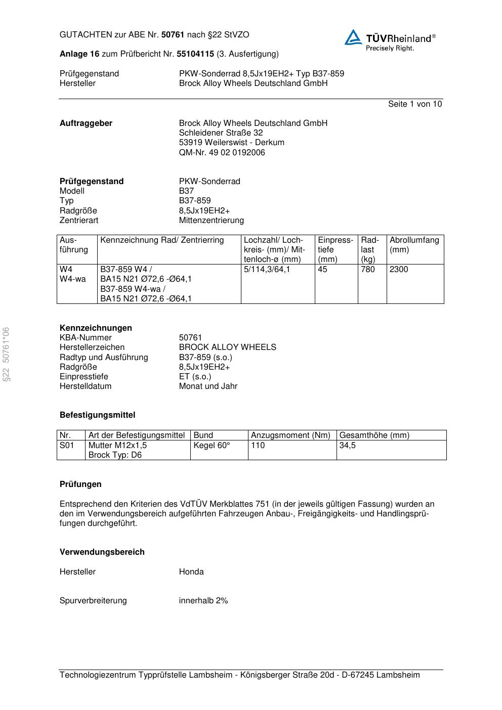 Dieses Gutachten (abe) bezieht sich auf die Alufelge Brock B37-85 9 in der Ausführung ET 0, Mittenloch 0 mm (KBA 50761). Im PDF findest du typischerweise zulässige Reifengrößen, Auflagen/Anbauhinweise und – je nach Dokument – Hinweise zur Eintragung.