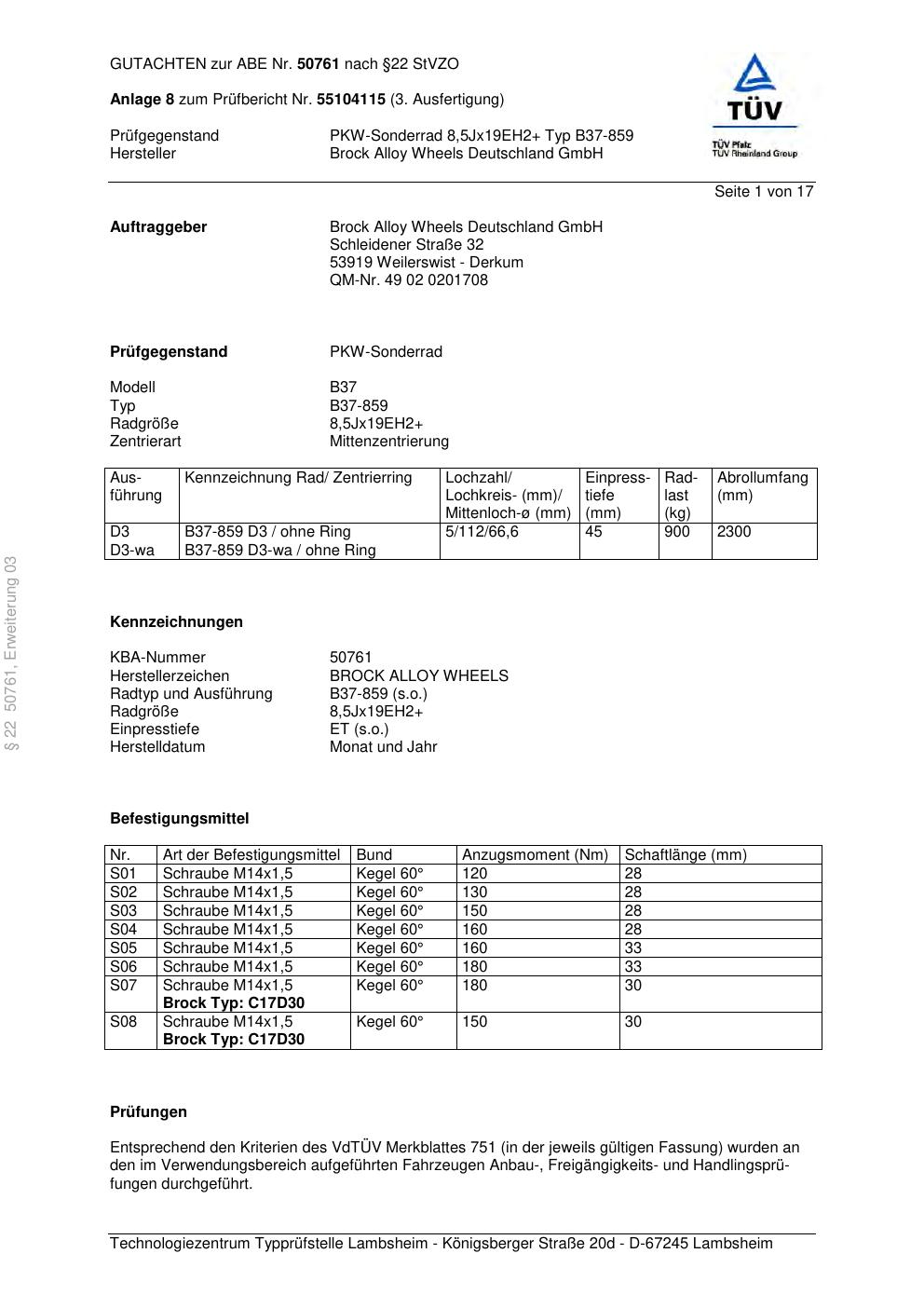 Dieses Gutachten (abe) bezieht sich auf die Alufelge Brock B37-859 in der Ausführung ET 0, Mittenloch 0 mm (KBA 50761). Im PDF findest du typischerweise zulässige Reifengrößen, Auflagen/Anbauhinweise und – je nach Dokument – Hinweise zur Eintragung.
