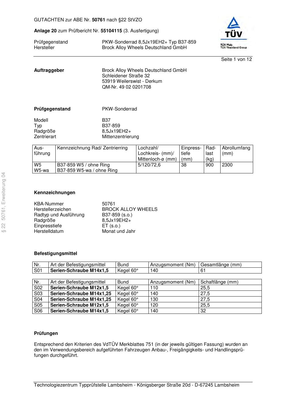 Dieses Gutachten (abe) bezieht sich auf die Alufelge Brock B37-859 in der Ausführung ET 0, Mittenloch 0 mm (KBA 50761). Im PDF findest du typischerweise zulässige Reifengrößen, Auflagen/Anbauhinweise und – je nach Dokument – Hinweise zur Eintragung.