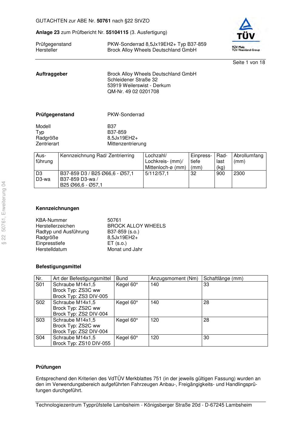 Dieses Gutachten (abe) bezieht sich auf die Alufelge Brock B37-859 in der Ausführung 8.5Jx19 ET 0, Mittenloch 0 mm (KBA 50761). Im PDF findest du typischerweise zulässige Reifengrößen, Auflagen/Anbauhinweise und – je nach Dokument – Hinweise zur Eintragung.