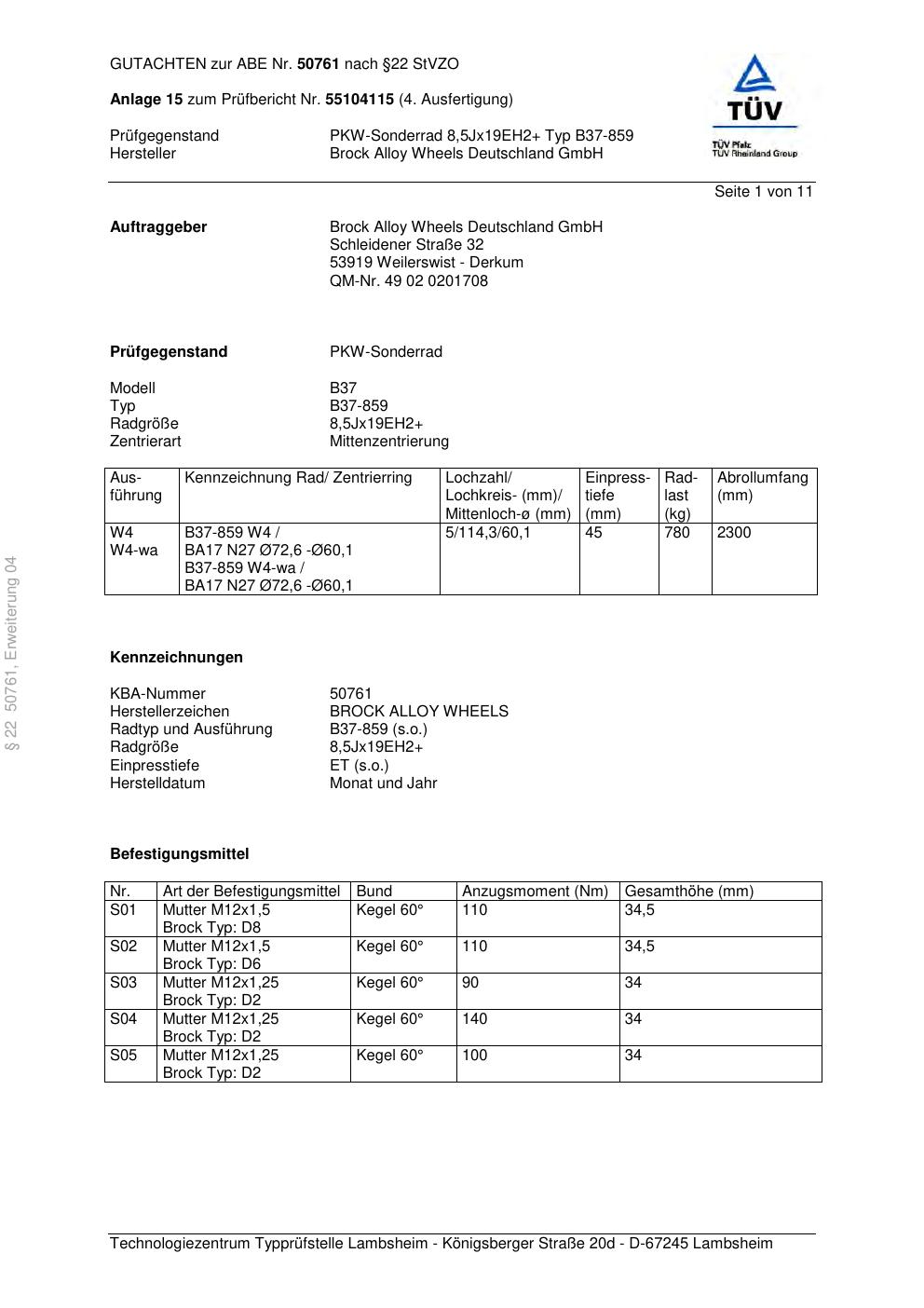Dieses Gutachten (abe) bezieht sich auf die Alufelge Brock B37-859 in der Ausführung ET 0, Mittenloch 0 mm (KBA 50761). Im PDF findest du typischerweise zulässige Reifengrößen, Auflagen/Anbauhinweise und – je nach Dokument – Hinweise zur Eintragung.