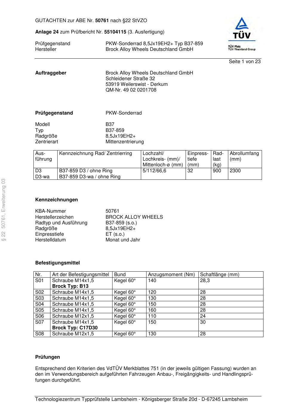 Dieses Gutachten (abe) bezieht sich auf die Alufelge Brock B37-859 in der Ausführung ET 0, Mittenloch 0 mm (KBA 50761). Im PDF findest du typischerweise zulässige Reifengrößen, Auflagen/Anbauhinweise und – je nach Dokument – Hinweise zur Eintragung.