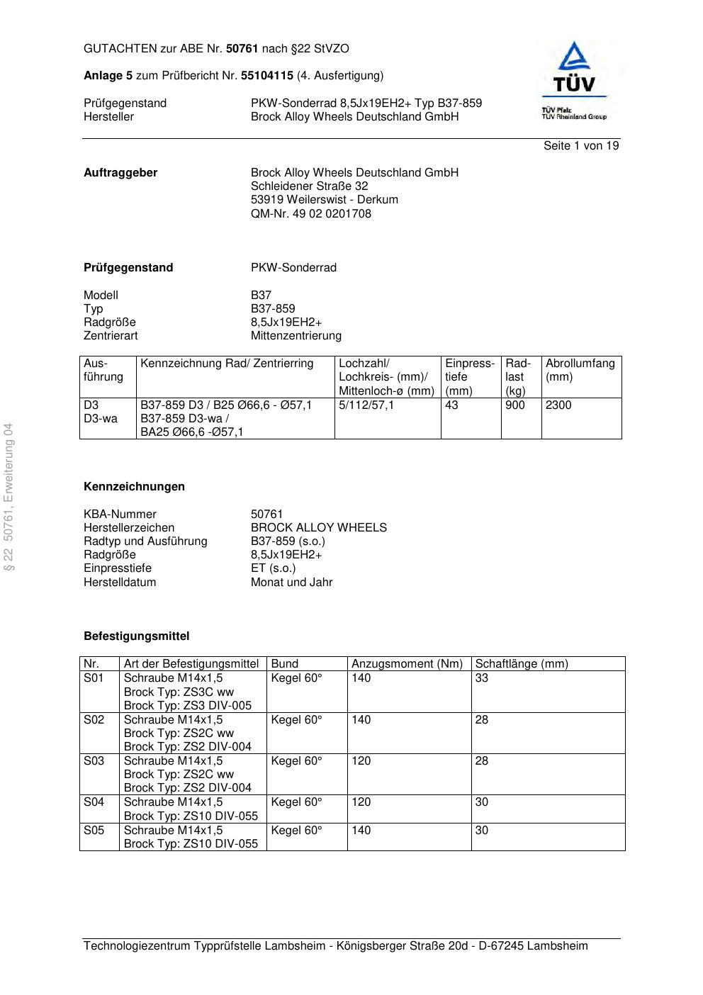 Dieses Gutachten (abe) bezieht sich auf die Alufelge Brock B37-859 in der Ausführung ET 0, Mittenloch 0 mm (KBA 50761). Im PDF findest du typischerweise zulässige Reifengrößen, Auflagen/Anbauhinweise und – je nach Dokument – Hinweise zur Eintragung.